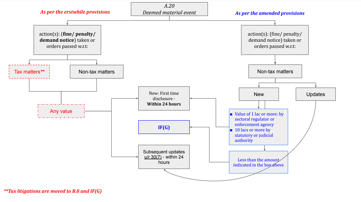 | Non-tax litigation | New | ✔ (based on the authority involved and the nature of action taken against the listed entity falling under sub-clause (a) to (i) of clause 20) | ✔ (based on materiality) | If all relevant information is maintained in SDD – within 72 hours from the receipt of notice. In other cases – within 24 hours from the receipt of notice. |