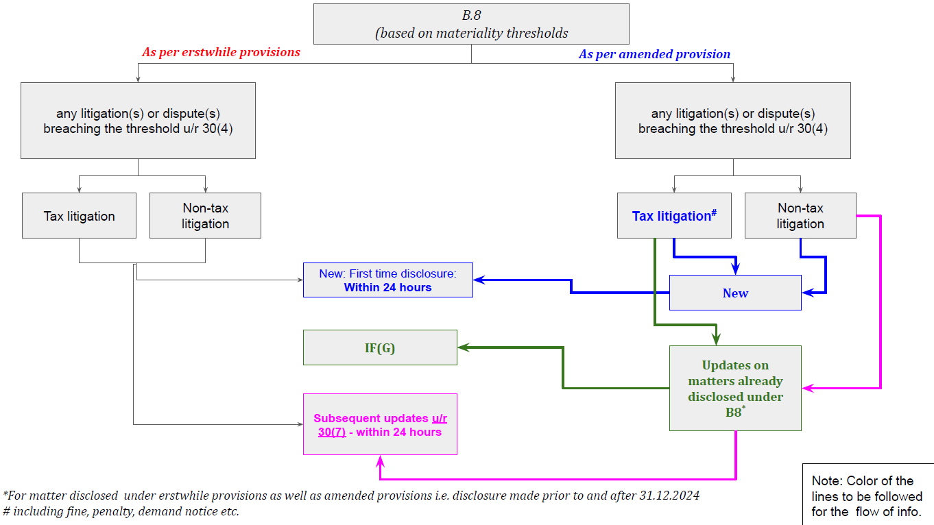 Note that the template of IF(G) requires the listed entity to inter-alia mention the ‘status of the litigation / dispute as per last disclosure’ as well as the ‘current status of the litigation / dispute’ which supports the argument that screening of all current tax litigations against the listed entity to determine if they are material or not is not required. What is required is to provide an ‘update’ on the already disclosed tax litigations.