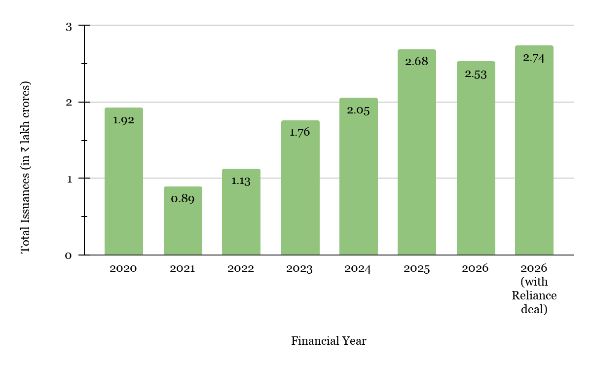 Volumes of securitisation (which, of course, have always included bilateral assignments or so-called DA transactions) fell by 6% in FY 26, if the origination volume by Reliance group entities in the first half were to be excluded. However, the market has shown more originator diversity, with an increasing share of smaller issuers, including those tasting the market for the first time.