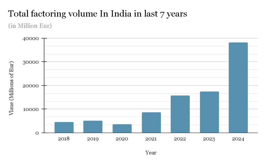Though Europe provides largest volumes globally, factoring in Asia as well has been growing rapidly in the last few years. Global factoring volumes reached EURO 3.66 Trillion in 2024 (up 3.6% from the previous year)1. In Asia-Pacific, India was the fastest-growing market in the region, up 120% to EUR 38.2 billion.2