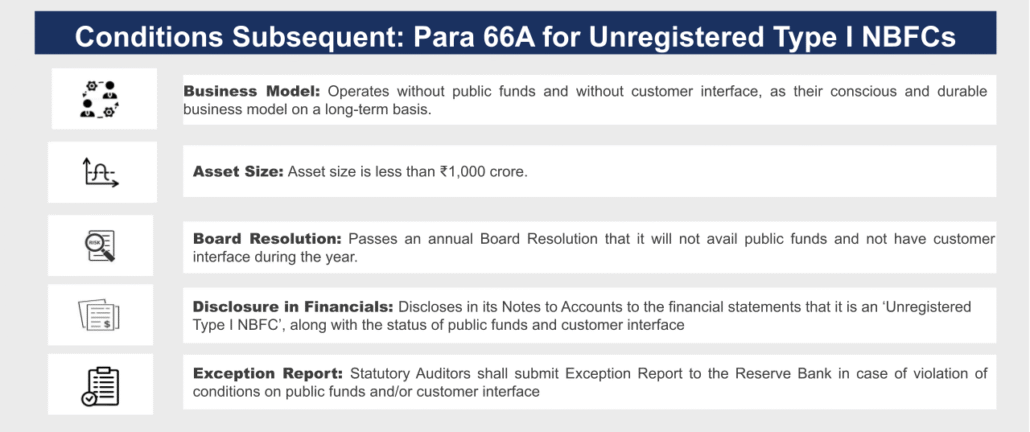 | Entities that fulfil the conditions for Unregistered Type I NBFC, after April 1, 2026 | Option 1: Satisfy the conditions under 66A and remain unregistered [see box on Conditions Subsequent] Option 2: Apply for registration as Type I NBFC |