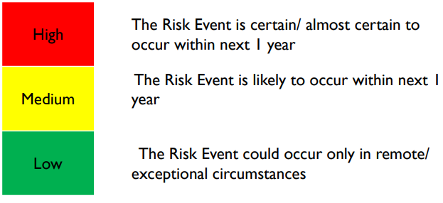 - What is the likelihood of this risk actually happening? This is simply the chance that the event might occur; You may assign parameters to determine the likelihood – for eg if the risk event is almost certain to occur in the next 1 year or is it likely to occur or it will occur only in remote situations?