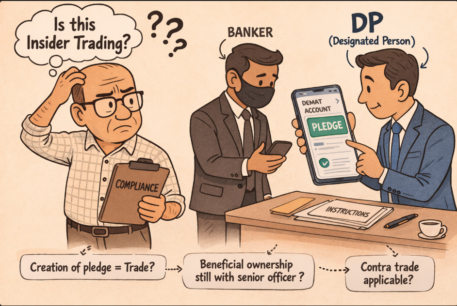 An August 2025 Informal Guidance by SEBI for Welspun Corp Limited sought to clarify the applicability of contra trade on release of pledge. However, it goes on to say that: “…in case of creation of pledge/ revocation, the beneficial ownership does not change till pledge is invoked”. While the IG was specific to revocation of pledge, this seems to be creating a confusion on the contra trade restrictions on creation of pledge. In this article, we discuss the nature of pledge as a trade, and applicability of trading related restrictions on various stages of pledge. Also see a detailed article on treatment of various stages of pledge as trading under PIT Regulations.