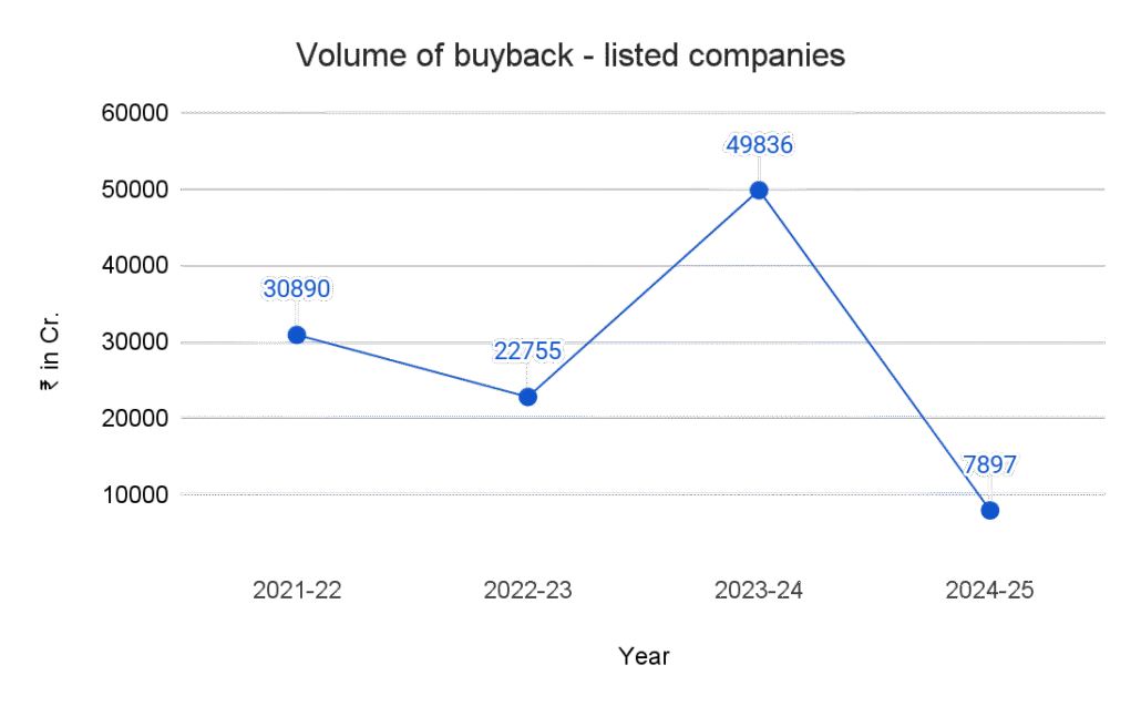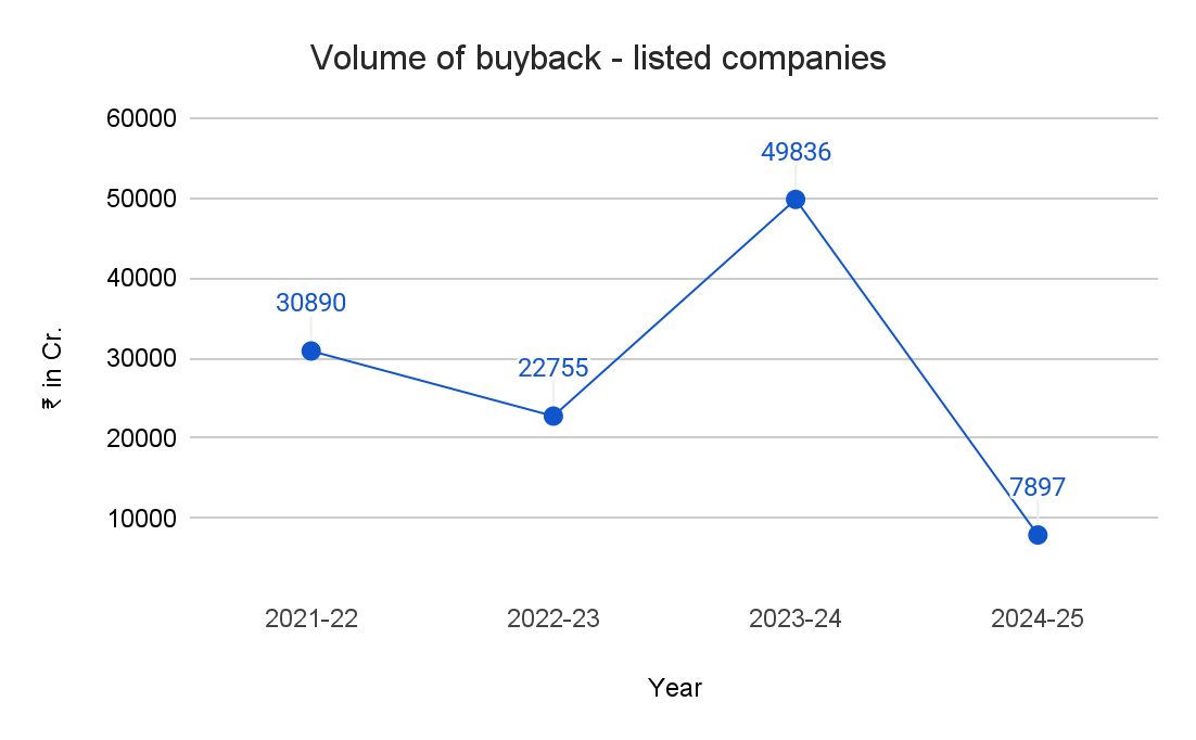 Resultant market reaction: a sharp decrease in buyback offers during FY 24-25 as compared to previous financial years. As per the publicly available data in case of listed companies, the total buyback size for 2024-25 was ₹7,897 Crores when compared to 2023-24 with a buyback offer size of Rs. 49,836 crores, indicating a decrease of 84.2 per cent.